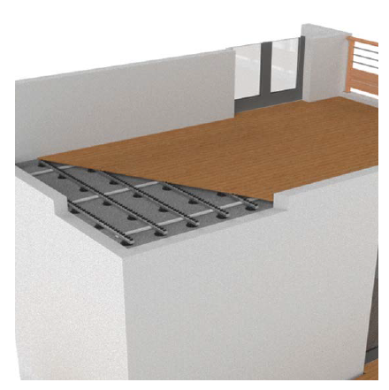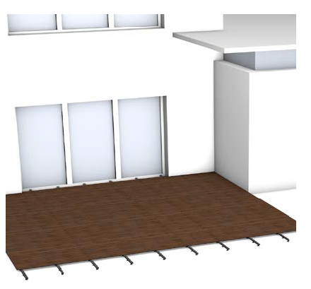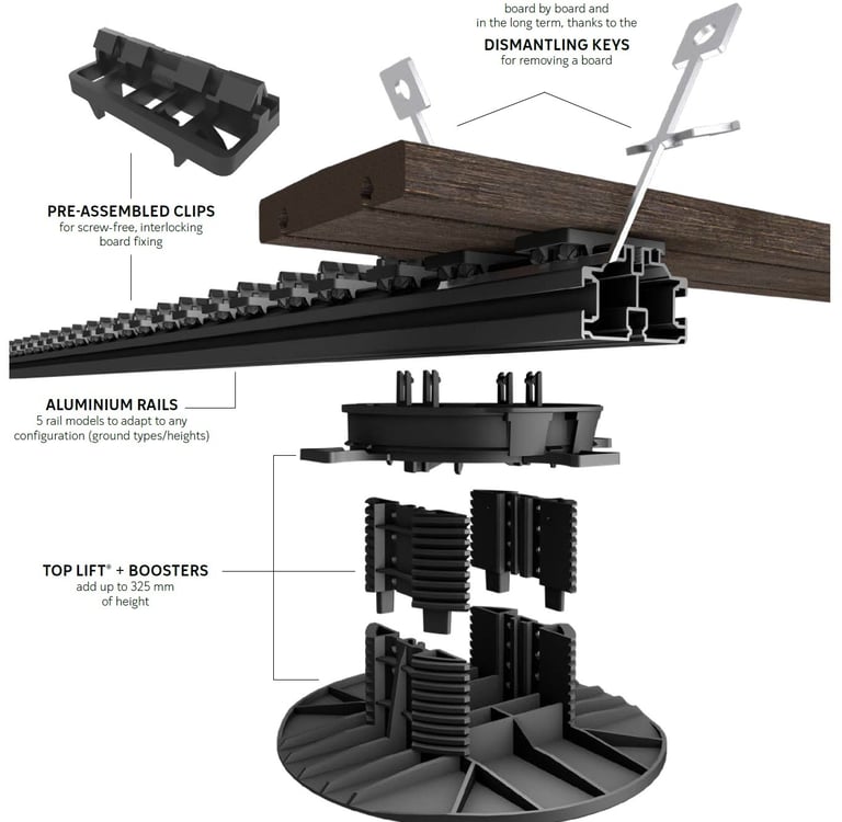The Top Rail is a PR24 rail with built-in Top Screw adjustement pads. It can only be installed on hard floors, for private projects. It can be used to raise the terrace while keeping a low height.